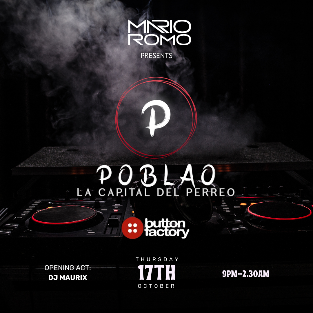 Following a very successful launch night, DJ Mario Romo returns to the Button Factory stage to perform his latest show Poblao | La Capital del Perreo mixing up dance, techno and Latin vibes.