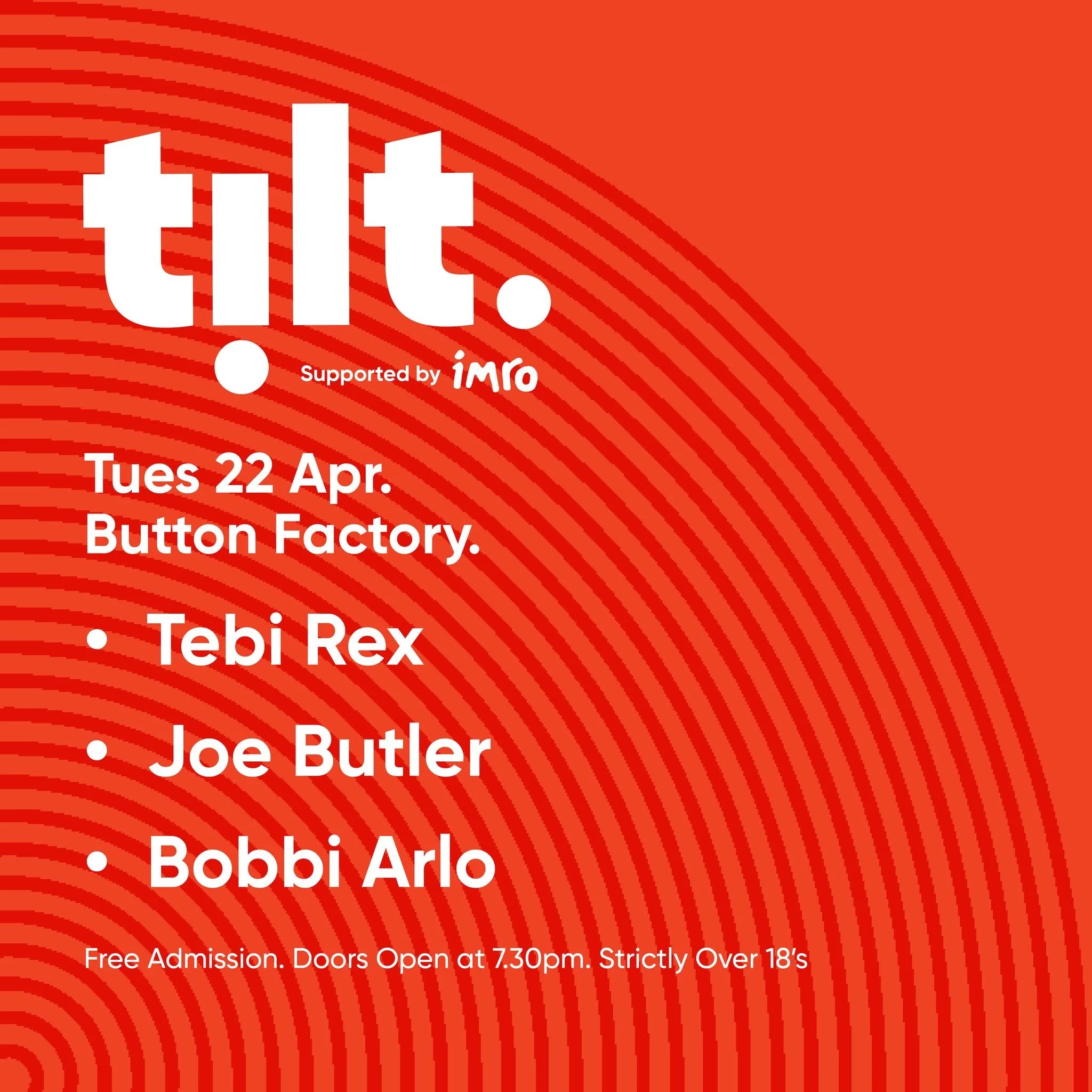 Tilt #33 takes place in The Button Factory on Tuesday April 22nd 2025 featuring these three wonderful acts - Tebi Rex, Bobbi Arlo & Joe Butler.
